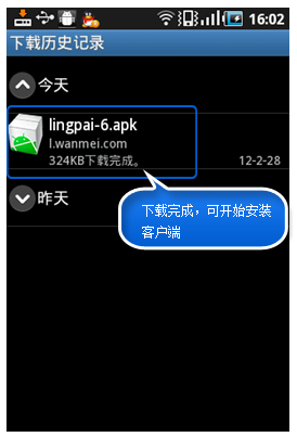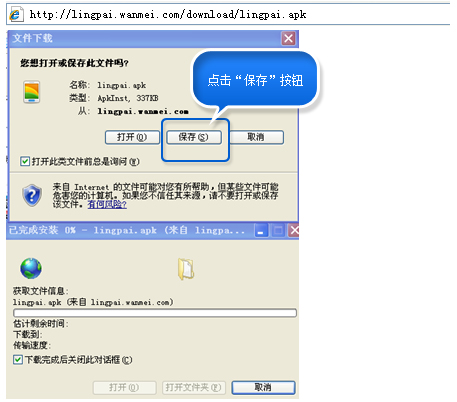 1.在网页上输入网址lingpai.wanmei.com/download/lingpai.apk,弹出消息框见图: