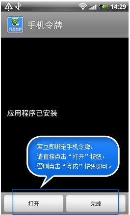 3.到此,客户端已安装好。若立即绑定手机令牌,请直接点击“打开”按钮,否则点击“完成”按钮即可。