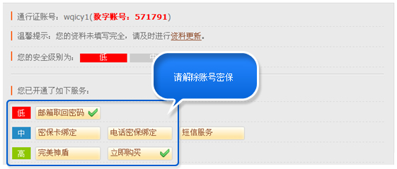2.如果您的账号绑定了密保卡、电话密保或完美神盾,请先解除账号的密保。如图: